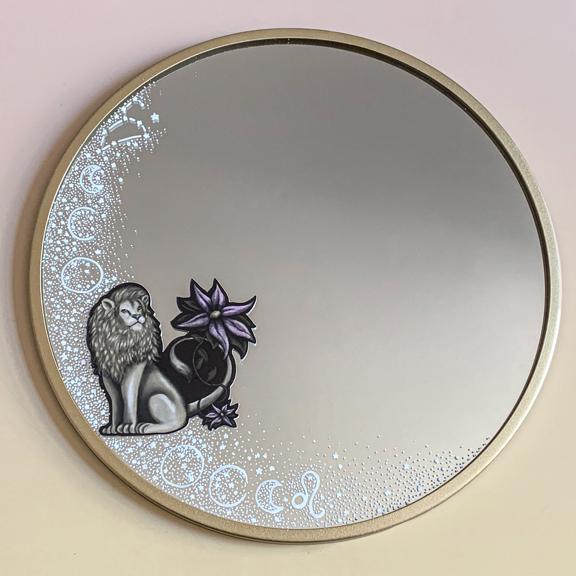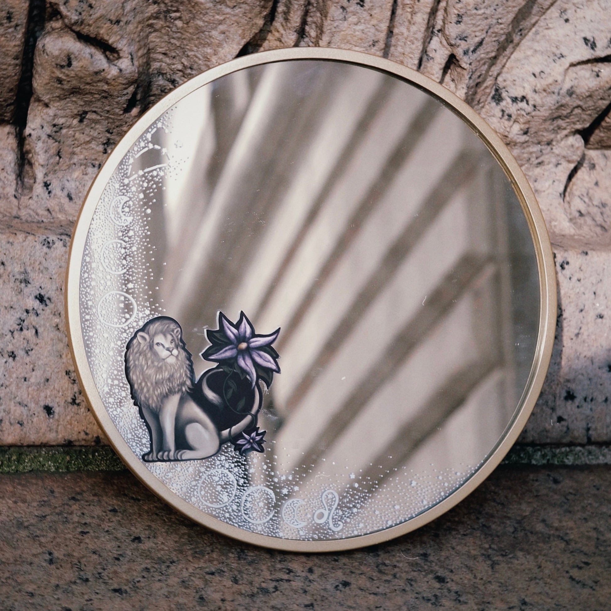 • a dreamy astrological mirror that measures 10" x 10," featuring a digitally printed zodiac illustration + hand painted constellation artwork
