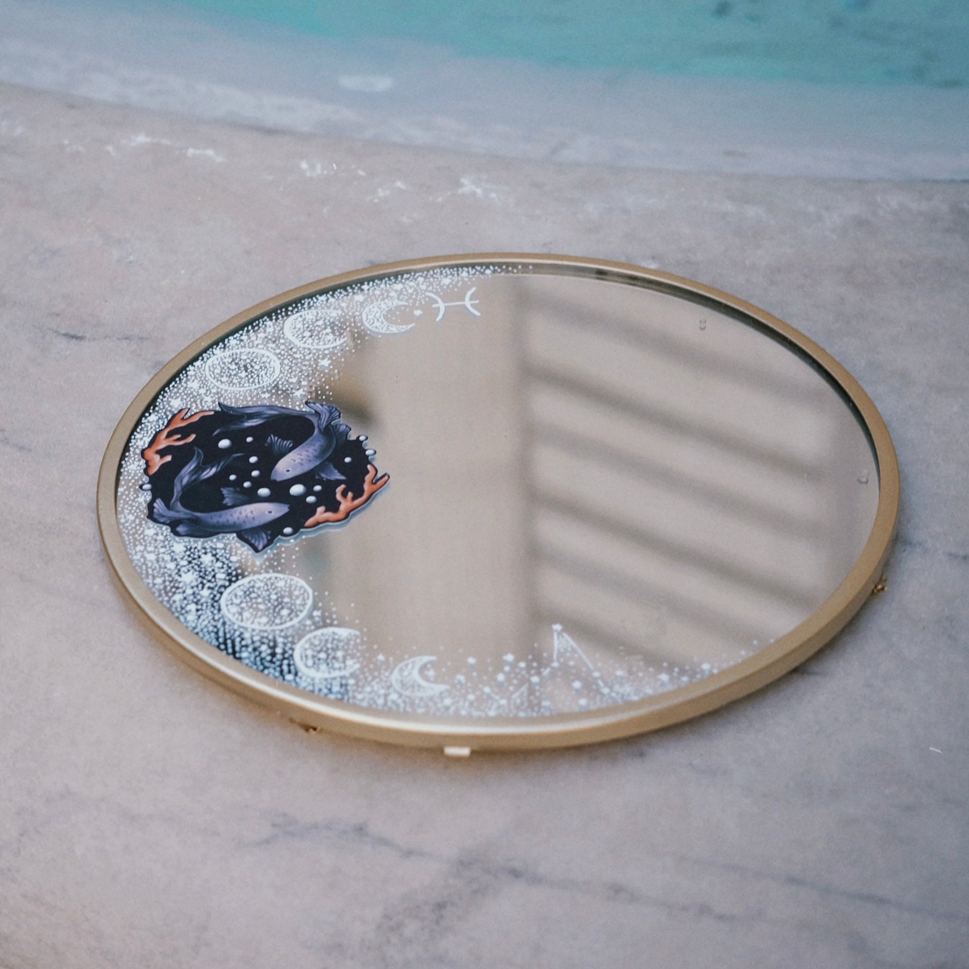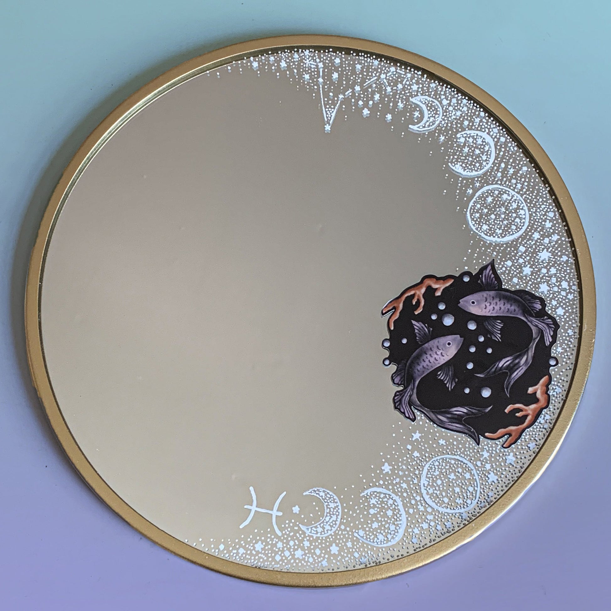 • a dreamy astrological mirror that measures 10" x 10," featuring a digitally printed zodiac illustration + hand painted constellation artwork